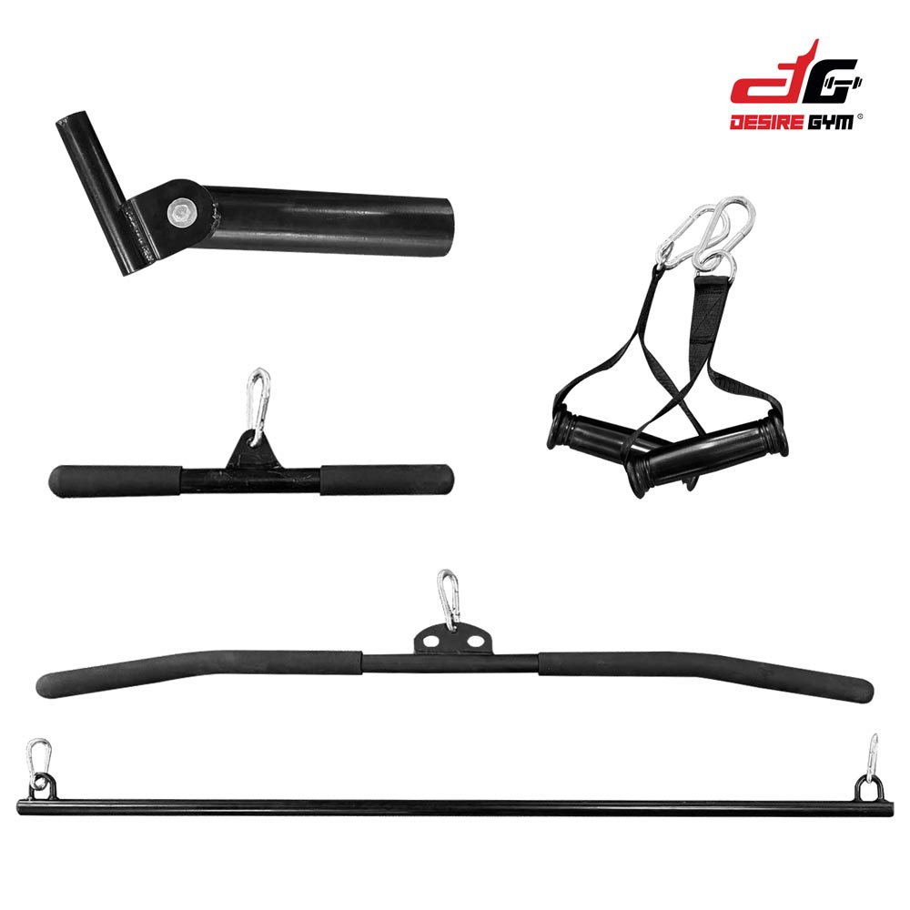 hort lat pull bar, long lat pull bar, a pair of long Safety bar, a pair of short safety bar, a pair of adjustable butterfly handle, a pair of dip attachment and sit-up cushion.